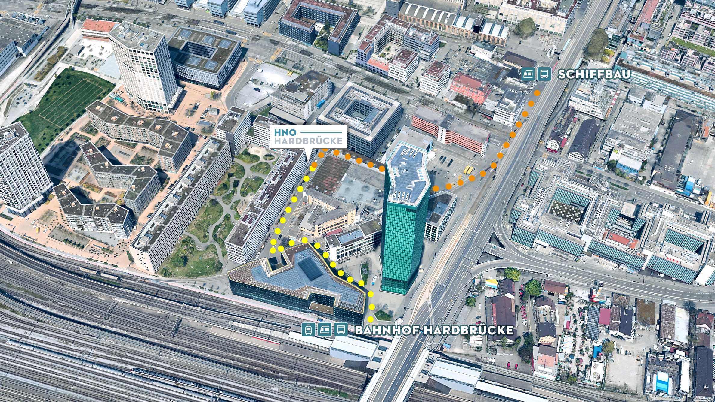 Von der Hardbrücke aus sehen Sie den Prime Tower, neben dem sich das Maag Areal mit der Tonhalle Maag befindet. Gleich dahinter verläuft die Naphtastrasse, an der unsere Praxis gelegen und mittels Schild gekennzeichnet ist.